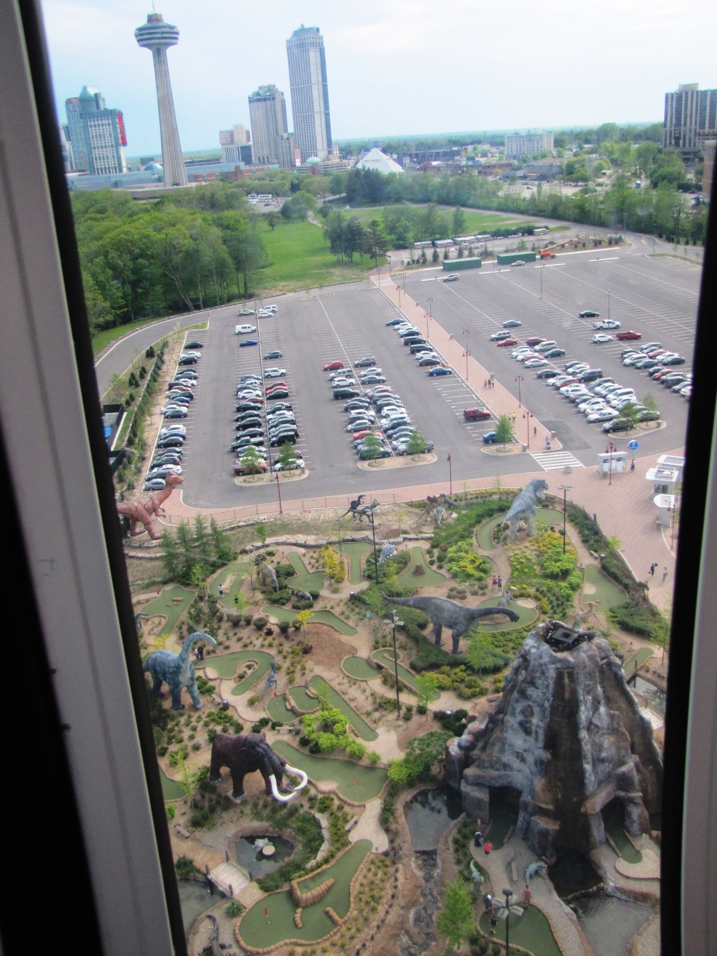 We had purchased Clifton Hill Fun Passes in advance (online purchases get you a bonus ride on the Skywheel) which grant admission to 5 attractions plus five tokens for the arcade. Given the choice of Wizards’ or Dinosaur Gold, we made the decision to go prehistoric and mostly enjoyed our 18 holes of miniature golf (the group behind us could have used